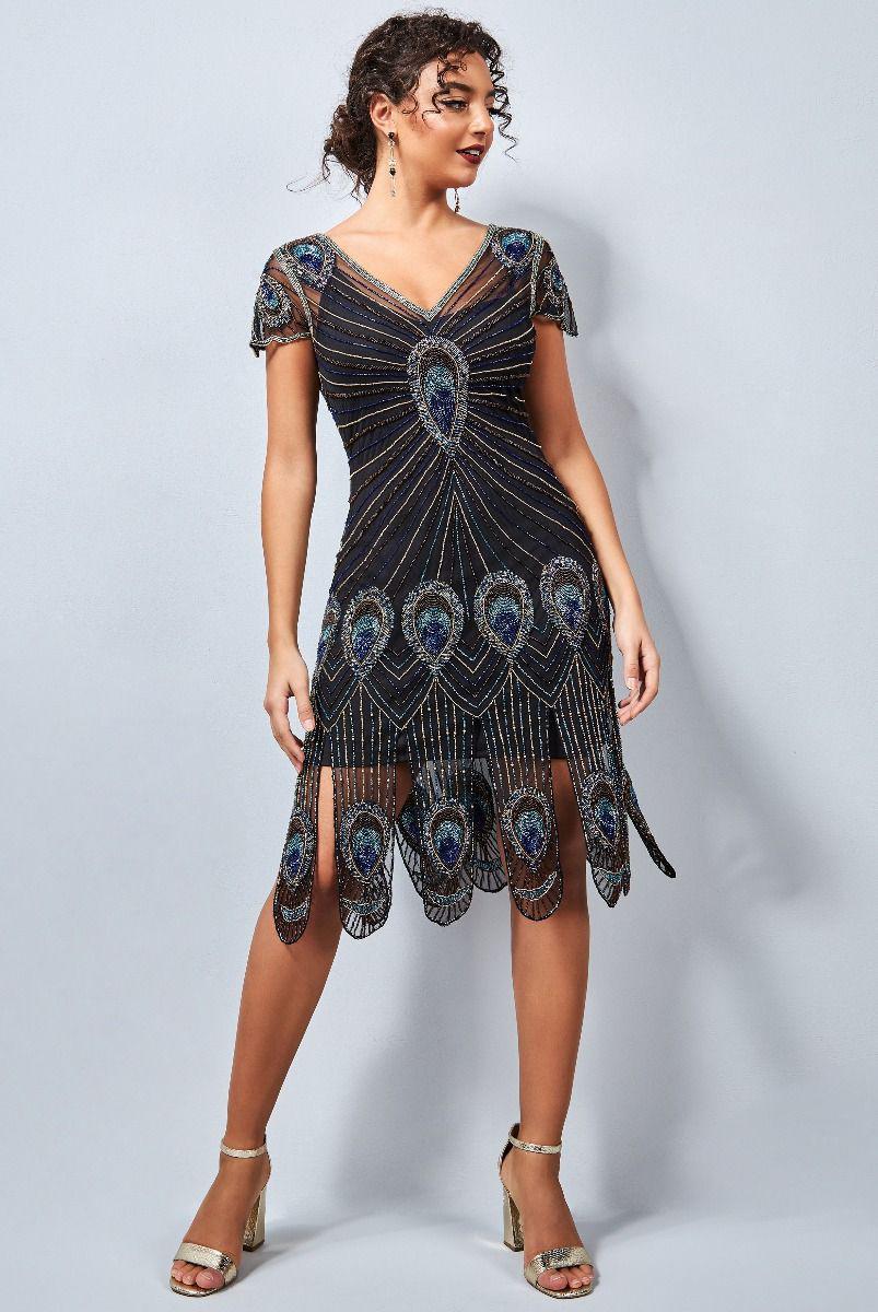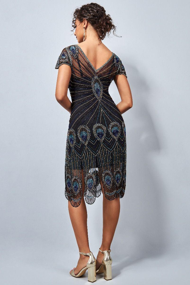 The Adelaide Flapper Dress embraces the iconic flapper silhouette, with its dropped waistline and loose, flowing design. The flap detailing along the hemline adds a playful touch, swaying as you move to the Charleston. Crafted from soft stretch mesh decorated with ornate deco-inspired beading in shades of peacock and gold. This elegant design features a flattering modern silhouette that hugs your bust and hips, while still staying true to the ’20s vintage feel with a semi-fitted (but not loose) waist. Darling scalloped cap sleeves and a mid-V neckline on both front and back define the era. A separate, washable stretch slipdress in navy is included. Beaded dress is dry clean only. Fabric has some stretch, size down for a slimmer, tighter fit. Available for custom order in your size, contact us here.