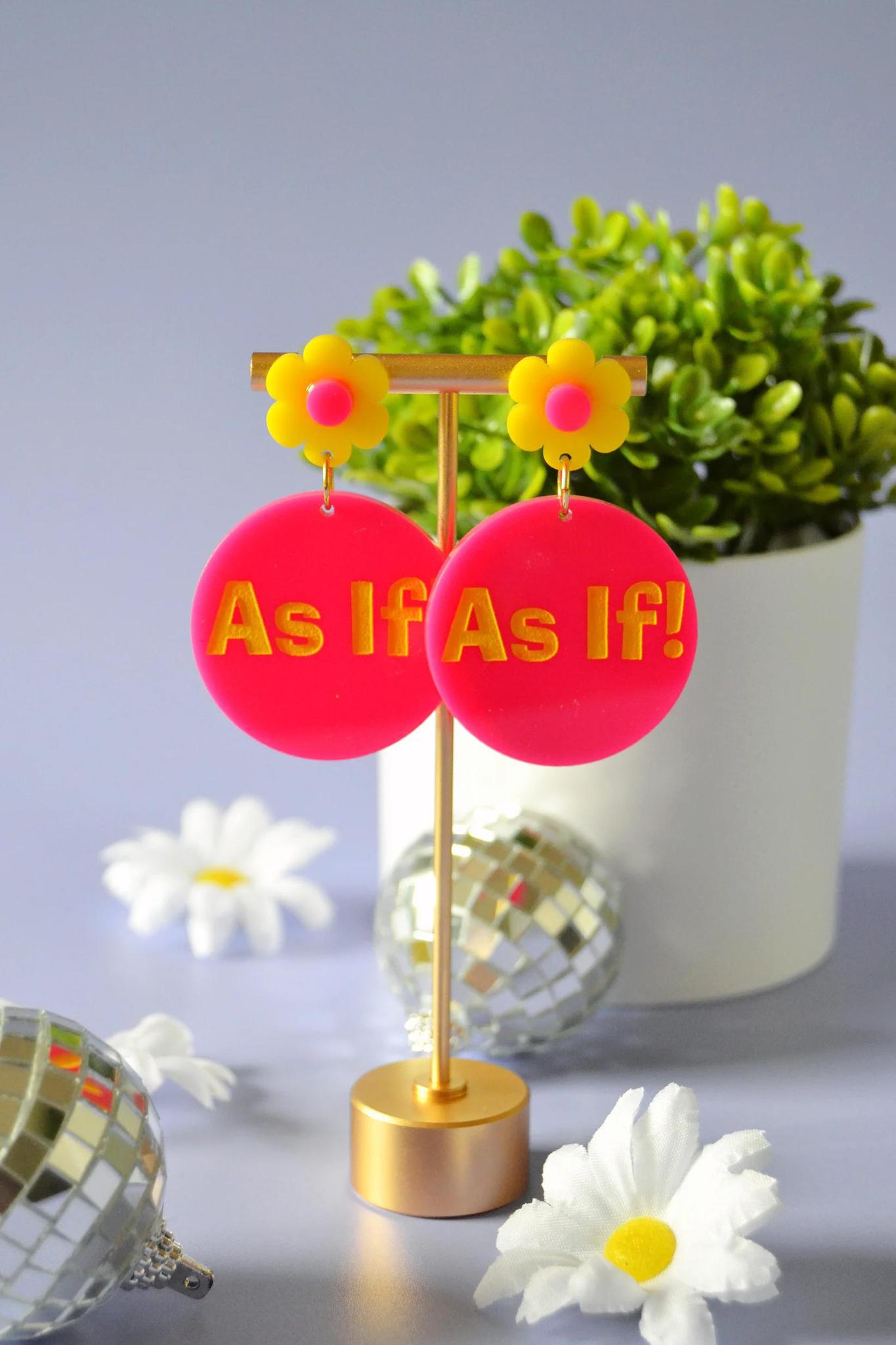 Cher Horowitz coined a two-word phrase that summed it all up, “AS IF”. Even decades after the movie Clueless was released, Cher’s catchphrase in the pop-culture zeitgeist remains unmatched. Done up in the classic Clueless font engraved and hand-painted on lightweight hot pink acrylic, they’re finished off with a yellow and hot pink daisy charm complete with an 18k gold-plated brass stud post backing for closure. Measures 2.25″ drop length, 1.65″ width. Made in the USA!