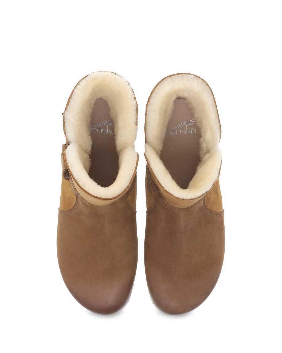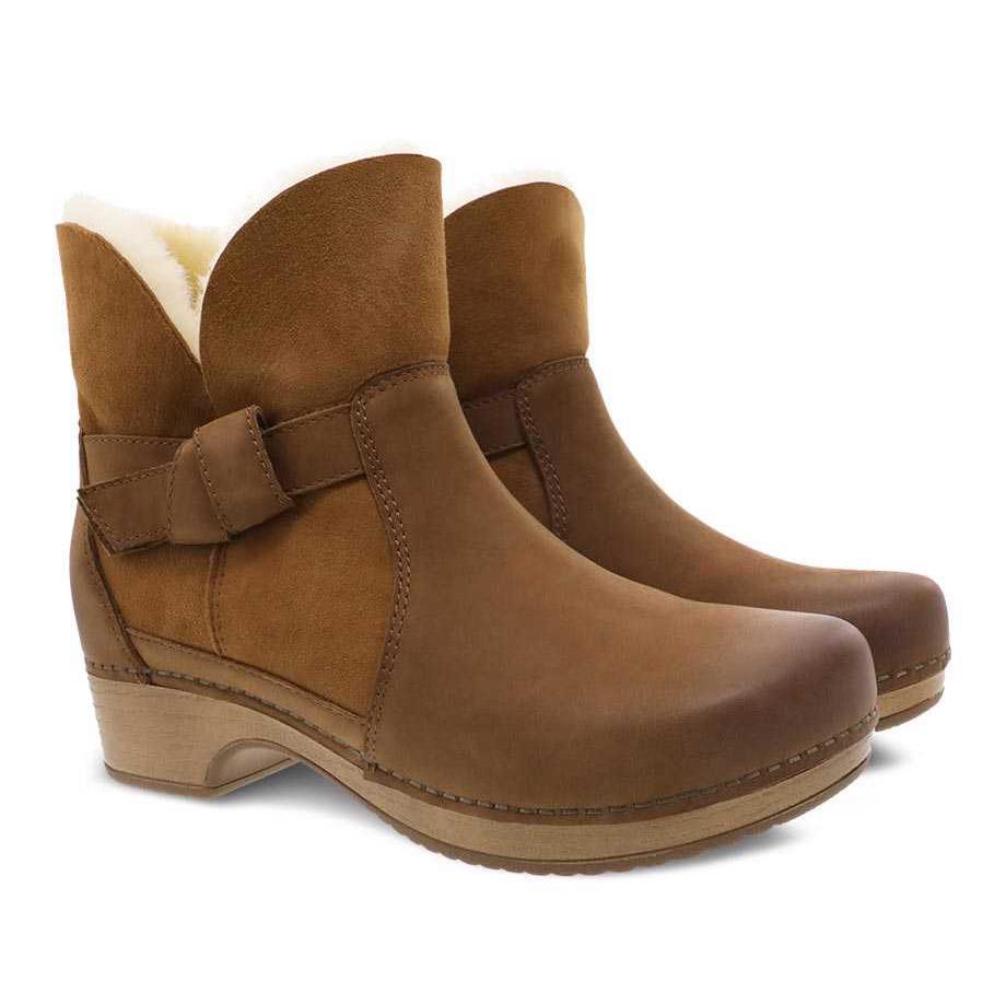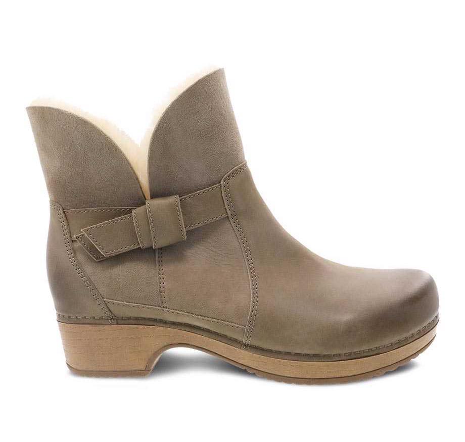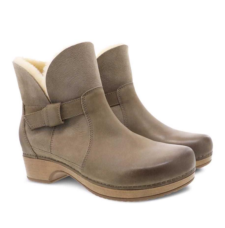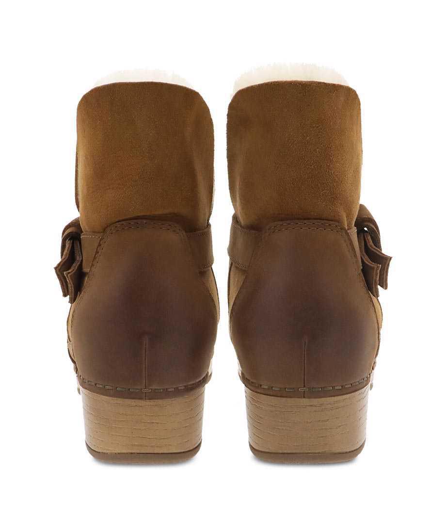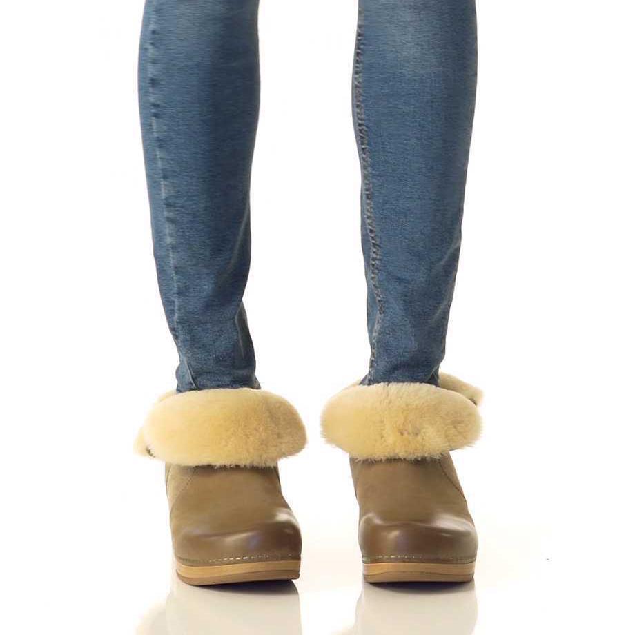 Your fave booties have arrived! The Bessie is a versatile, shearling-lined, low pull-on bootie that can be worn two ways. Worn with the top folded over, this boot showcases a cozy shearling detail. This casual, weekend-ready style features Dansko’s patent-pending stapled construction, linings with Aegis Microbe Shield for odor control, leather uppers treated with 3M Scotchgard protector for stain resistance, and a lightweight EVA outsole for long-lasting wear. Leather uppers. Nubuck treated with 3M Scotchgard™ protector for stain resistance. Heel is just under 1.5″. Available in Honey and Taupe.