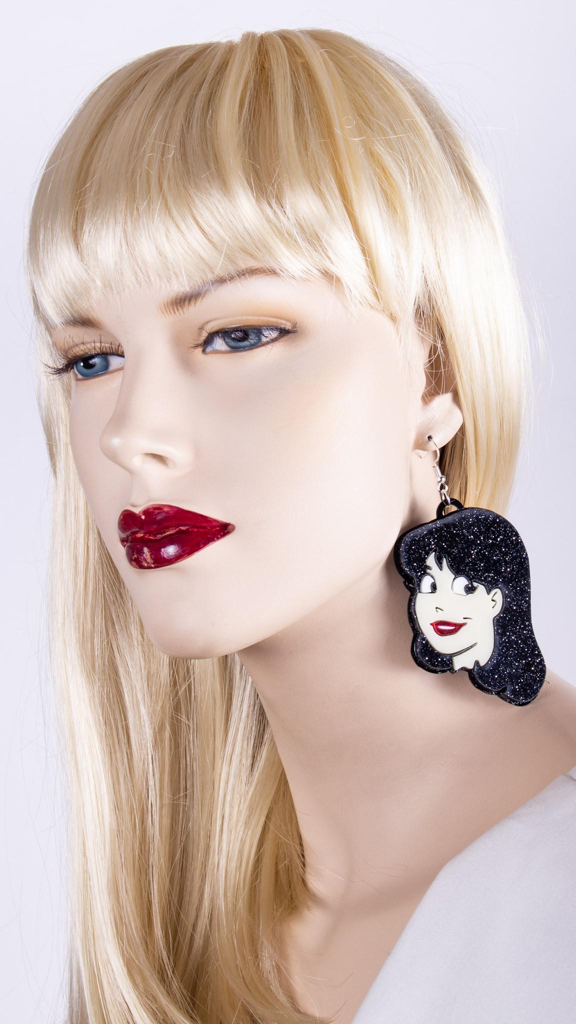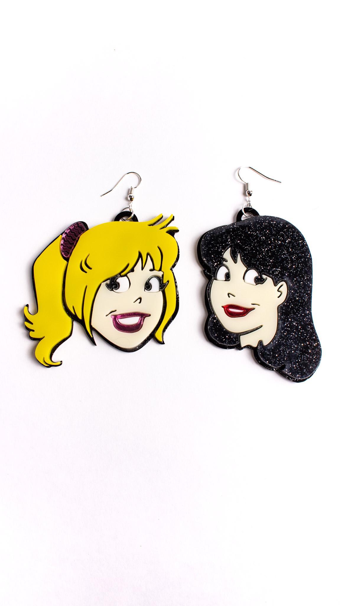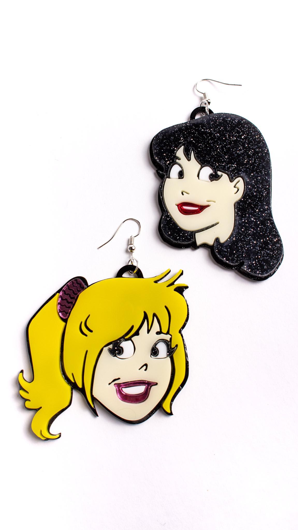 Are you a Betty or a Veronica? These excellent earrings have been hand-designed and laser cut from 1/8″ and 1/16″ inch acrylic sheets. Each piece measures about 2″. If you prefer a pair of just Betty’s or just Veronica’s that’s no problem! These hang from silver ear hooks. Handmade in the USA!