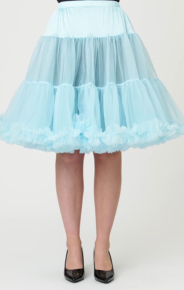 Soft, netted sheer chiffon petticoat gives you just the right amount of volume for that lady-like look. Elastic waist is comfortable, light and easy to wear, boasting two fluffy layers with ruffled hem detail for a feminine touch. Hits just below the knees for a length that goes with numerous retro-style dresses and skirts. 100% Nylon. Hand wash, hang to dry. One size fits most. Available in White, Pink, Red, Purple, Blue or Black.
