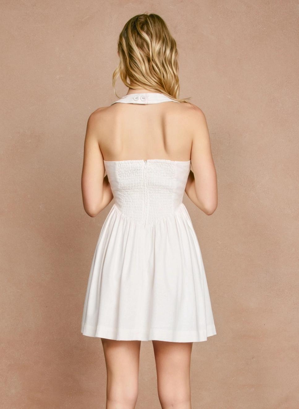 The Christy Mini Dress is crafted from a medium-weight cotton-linen blend. Featuring an adjustable halter neck with multi button closures, and a fit and flare skirt with a dipped waistline. Fully lined with a smocked back panel and hidden zipper closure. 55% Linen, 45% Viscose, lining 100% Cotton.