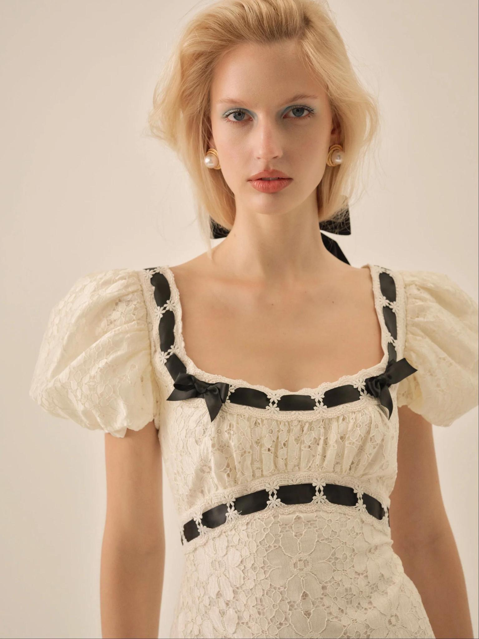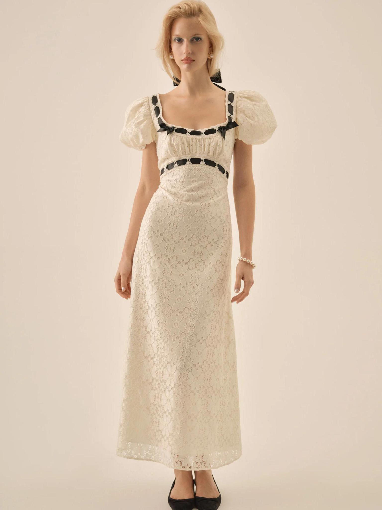 An ode to the soirées of a bygone era, the Creampuff lace maxi dress recalls the elegance of vintage-inspired gowns. This cream maxi dress spotlights elasticated puff sleeves, a ruched contoured bust, and slotted lace ribbon trims throughout. This gorgeous dress is fully lined with a low open back. Invisible zipper at the center-back with gripper tape along hem of sleeves. Dress 100% polyester, lining 100% polyester. Dry clean only.