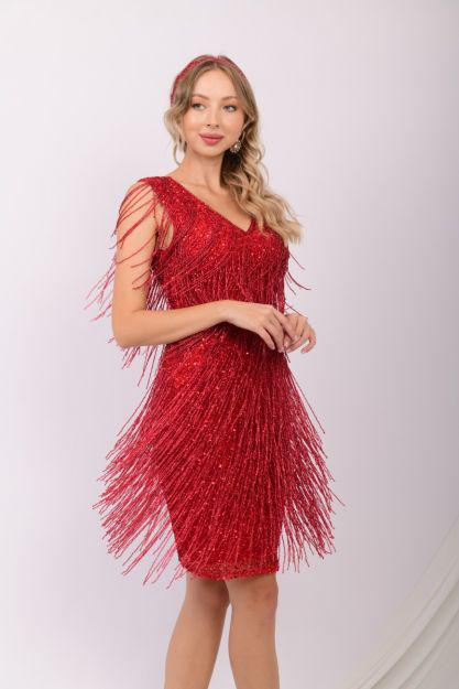 Radiate charm and elegance with the Dolly Sequin Fringe Flapper. Designed with intricate sequins and cascading fringe, this sleeveless dress captures movement and sparkle for an ultra-chic look. The V-neckline and tailored fit flatter the silhouette, making it the ultimate choice for your special occasion. 100% Polyester. Dry clean only. Fabric has some stretch, size down for a slimmer and tighter fit. Available in Ice, Blush, Red or Black. Available for custom order in your size, contact us here.