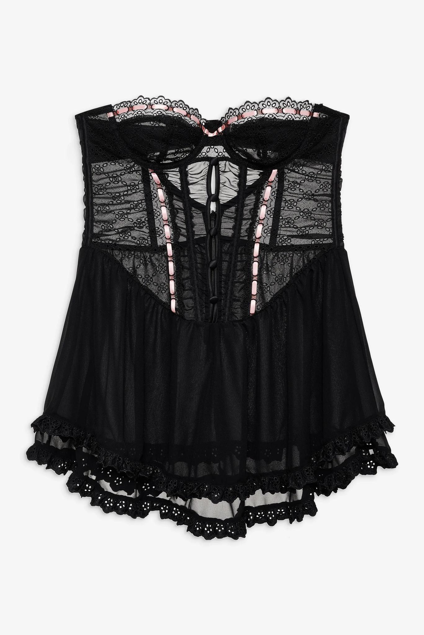 Designed for the Muse who loves to wear her lingerie out, the Elena Eyelet black slipdress is crafted in a sexy sheer eyelet embroidery and lightweight chiffon. This corset mini dress features underwire cups, a fully boned bodice, and full gathered skirt. Crafted in 100% polyester. Hand wash cold, hang to dry.