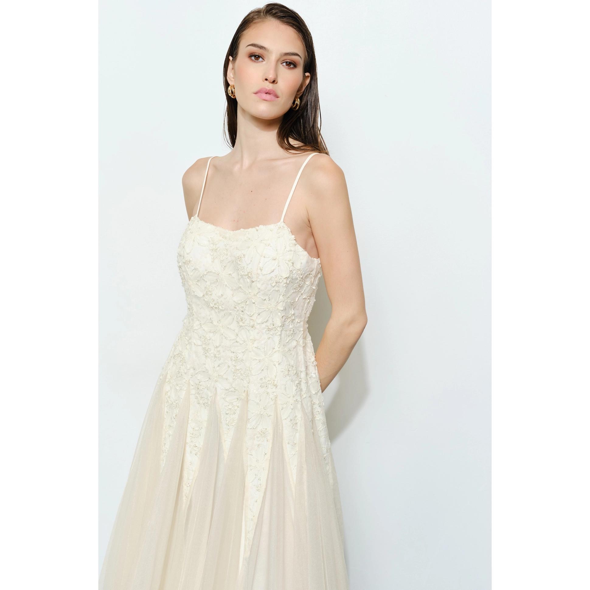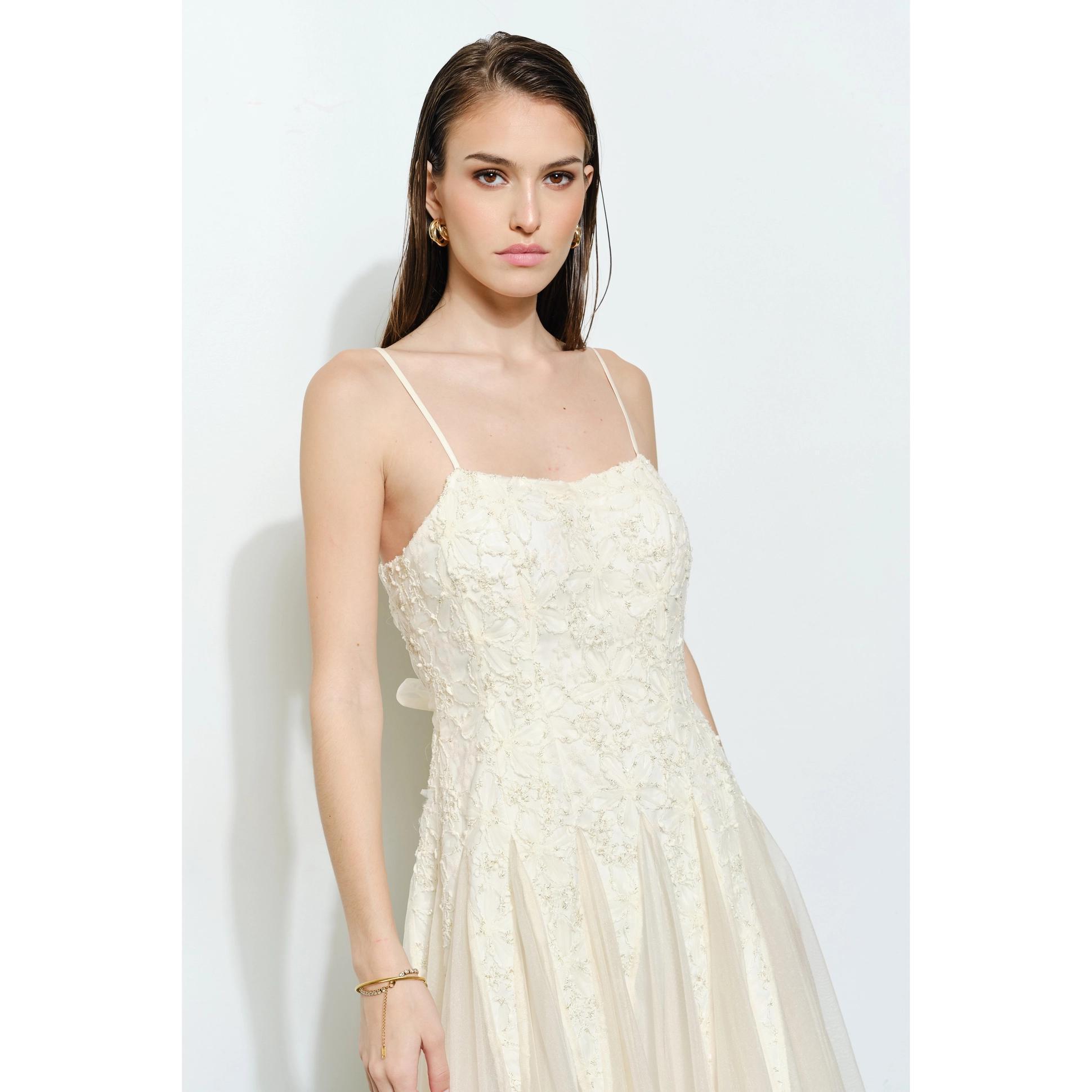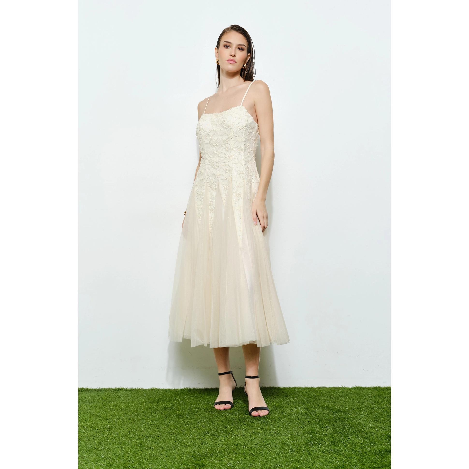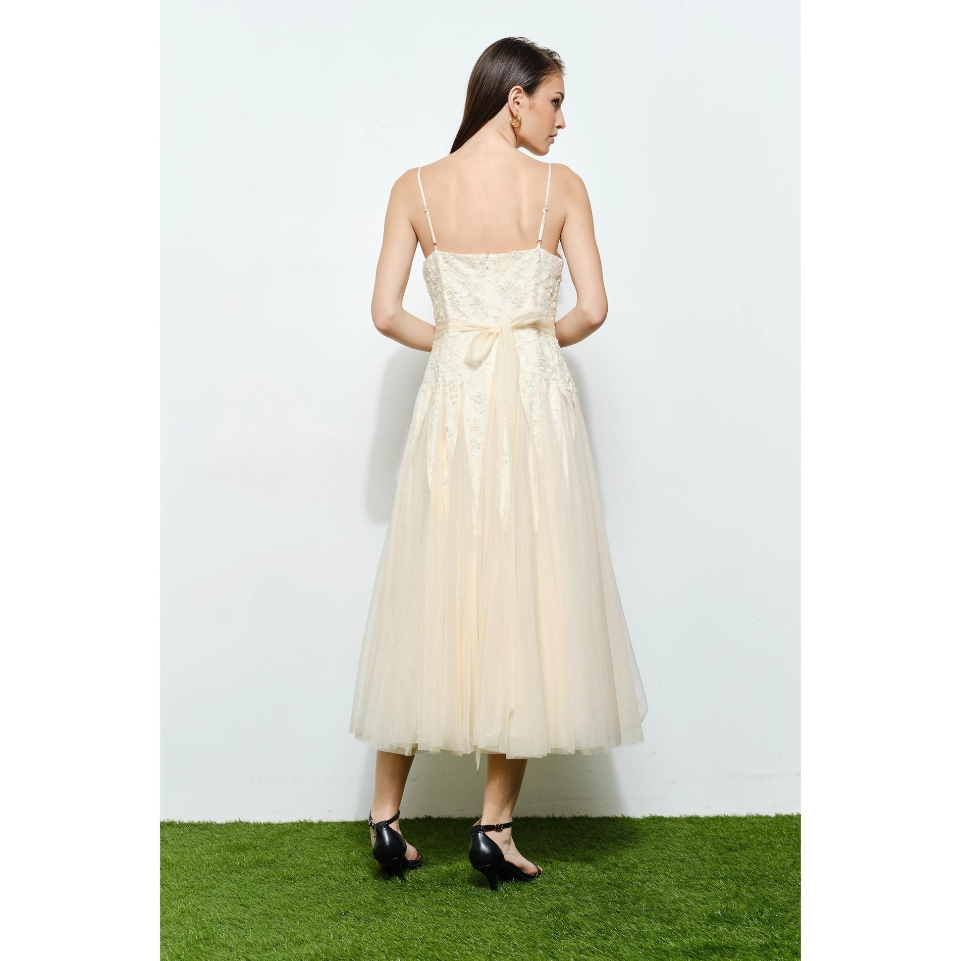 Meet Emma, springtime’s romantic floral lace, lurex embellished, chiffon tulle midi dress! Crafted from a soft ivory fabric with a chiffon over layer. Fully adjustable straps, paired with a chiffon sash that ties in the back at the waist allow for the perfect fit. Zips up the back to close. 100% Polyester. Dry clean only.
