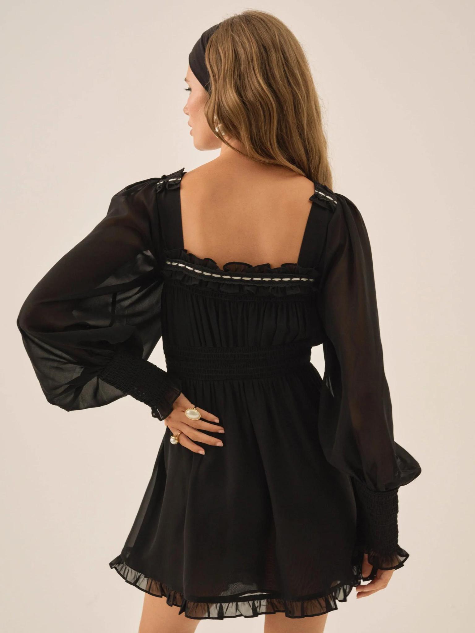 Inspired by the glamour of a bygone era, the Emmie black mini dress was inspired by vintage silhouettes. This long sleeve mini dress spotlights a square neckline, long blouson sleeves, smocking at the waist and shoulders, plus slotted ribbon lace trims throughout. This playfull mini is fully lined, with a functional satin ribbon bow at the front neckline. 100% polyester. Hand wash cold, hang to dry. Measurements taken flat, great stretch in the waist and good room in the bust.