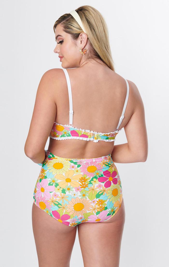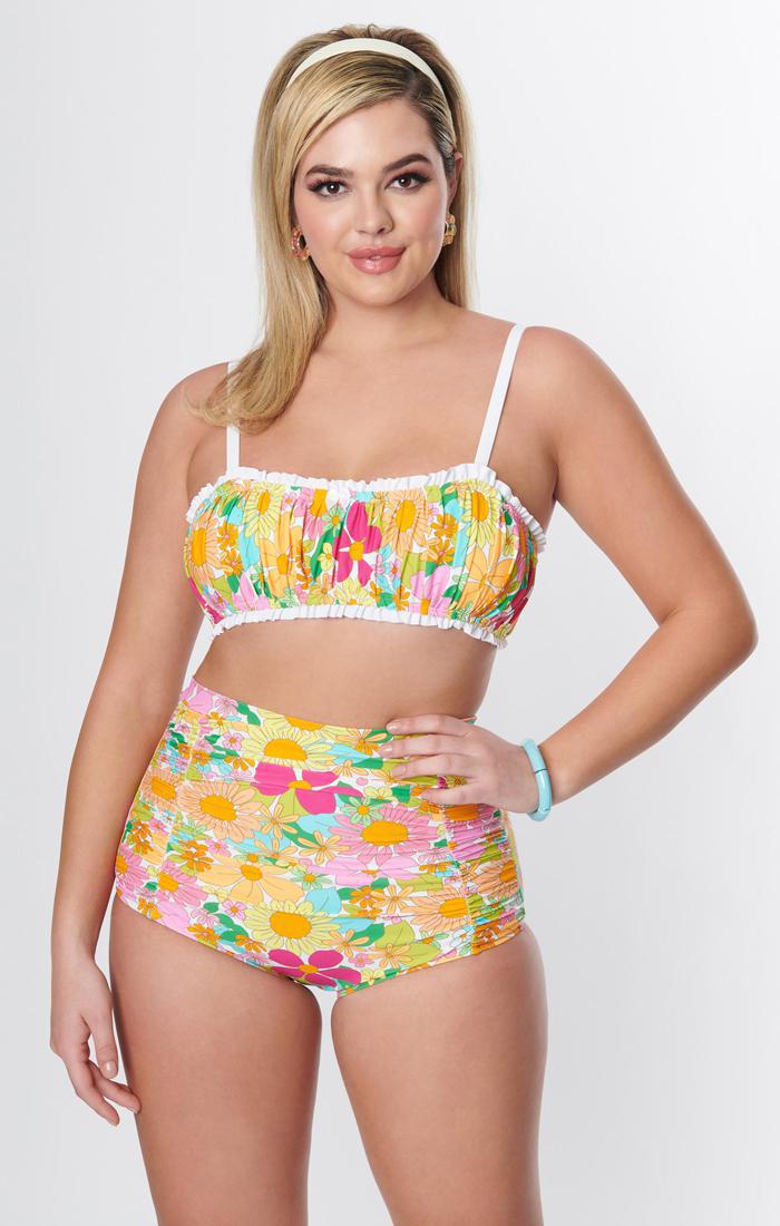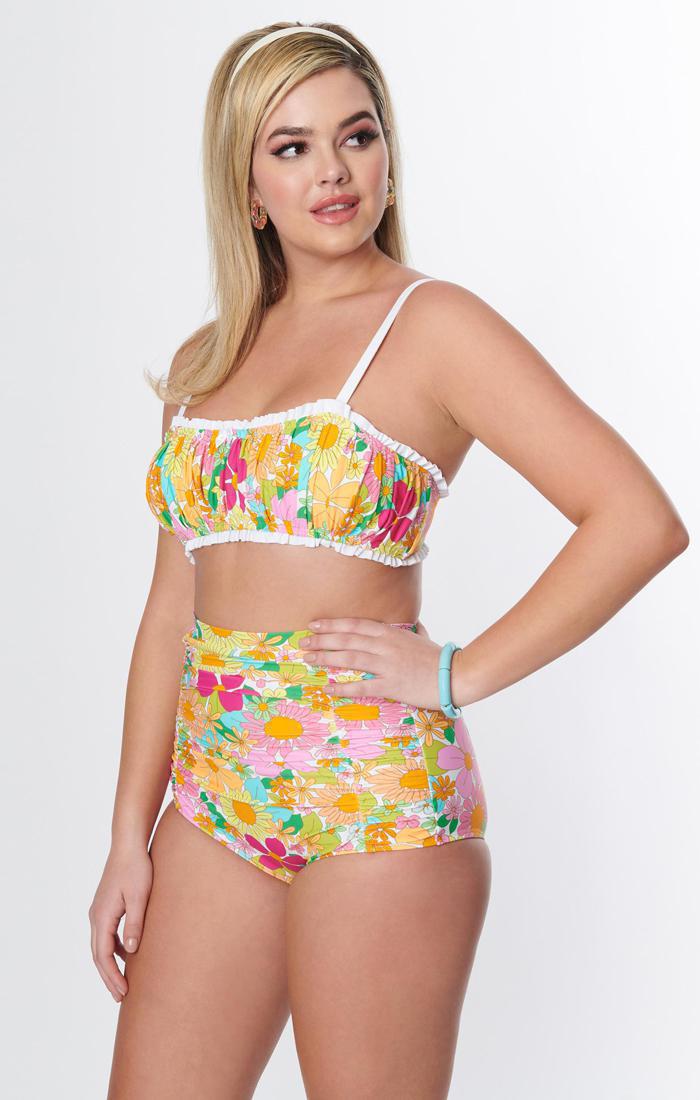 Cast in a playful 70’s-inspired multicolor floral, this bikini set will keep you looking and feeling cute all day at the beach. The material is soft yet sturdy and just a bit silky, and it features slight ruching along the hips and tummy. The top features shirred embellishment and is outfitted with adjustable removable straps, removable padding, side boning and secured with a hook back. The high-waisted swim bottoms slim your waist, tuck your tummy and give you a bit of a boost just where you need it. The back is perfectly smooth and stretchy, while the wide waistband will keep you feeling secure. Shell 82% Nylon, 18% Spandex, Lining 100% Polyester. Machine or hand wash, line dry.