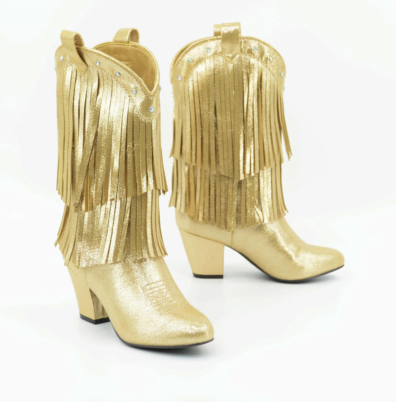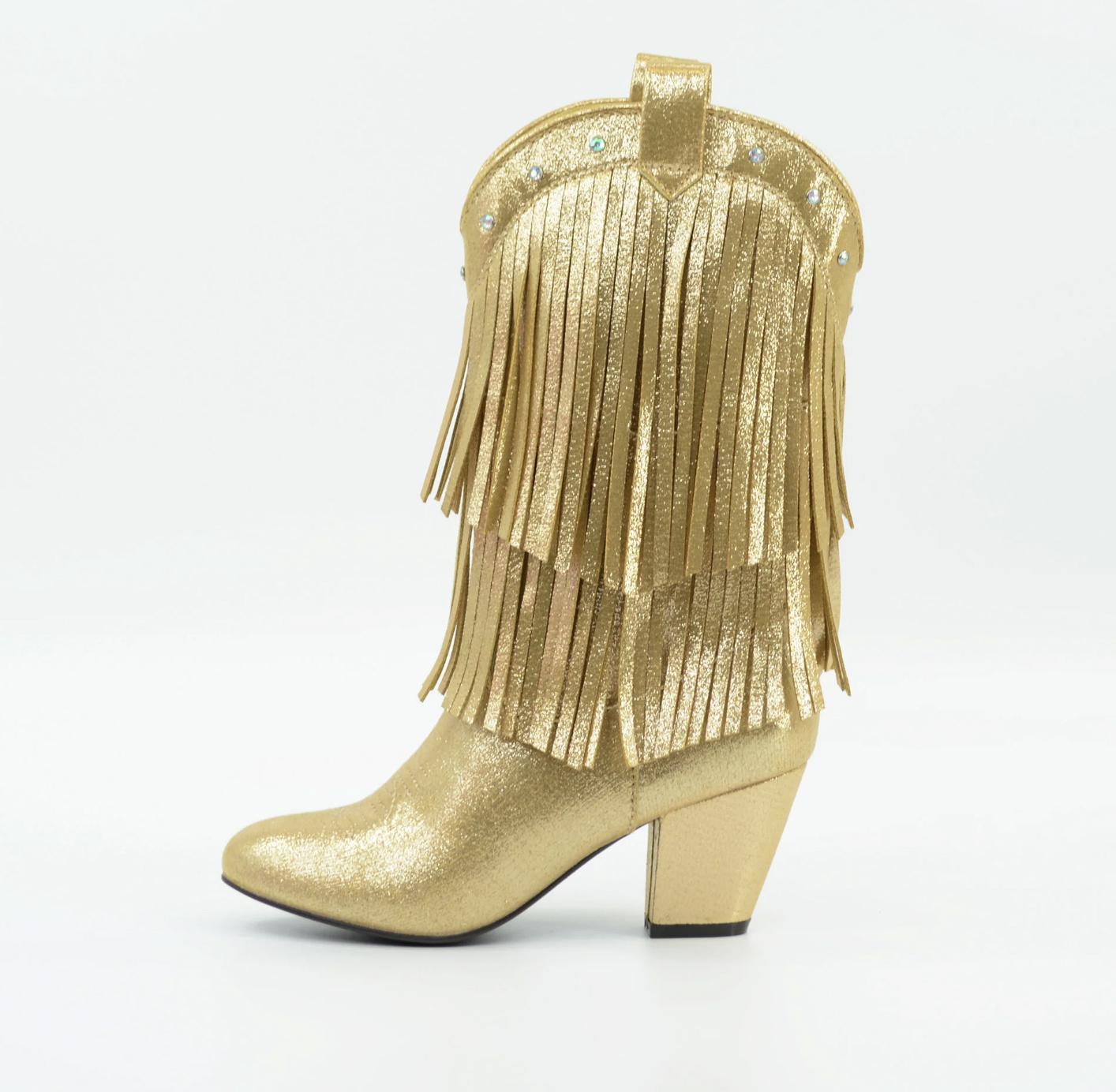 Huzzah, Hurrah! Absolutely stunning 50’s-inspired double fringe rhinestone detailed comfy western boot. This amazing glam fringe boot is fully padded with memory foam for maximum comfort. Upper material: Metallic sheen fabric w/ high shine iridescent rhinestones. Lining: man-made + canvas fabric. Heel height: 3″, step-in boot. Shaft Height: 7 1/2″ / mid-calf height. 100% vegan. Fits true to size, however if you take a wider width please size up 1/2 for the most comfortable fit. Available in metallic gold in whole and half sizes.