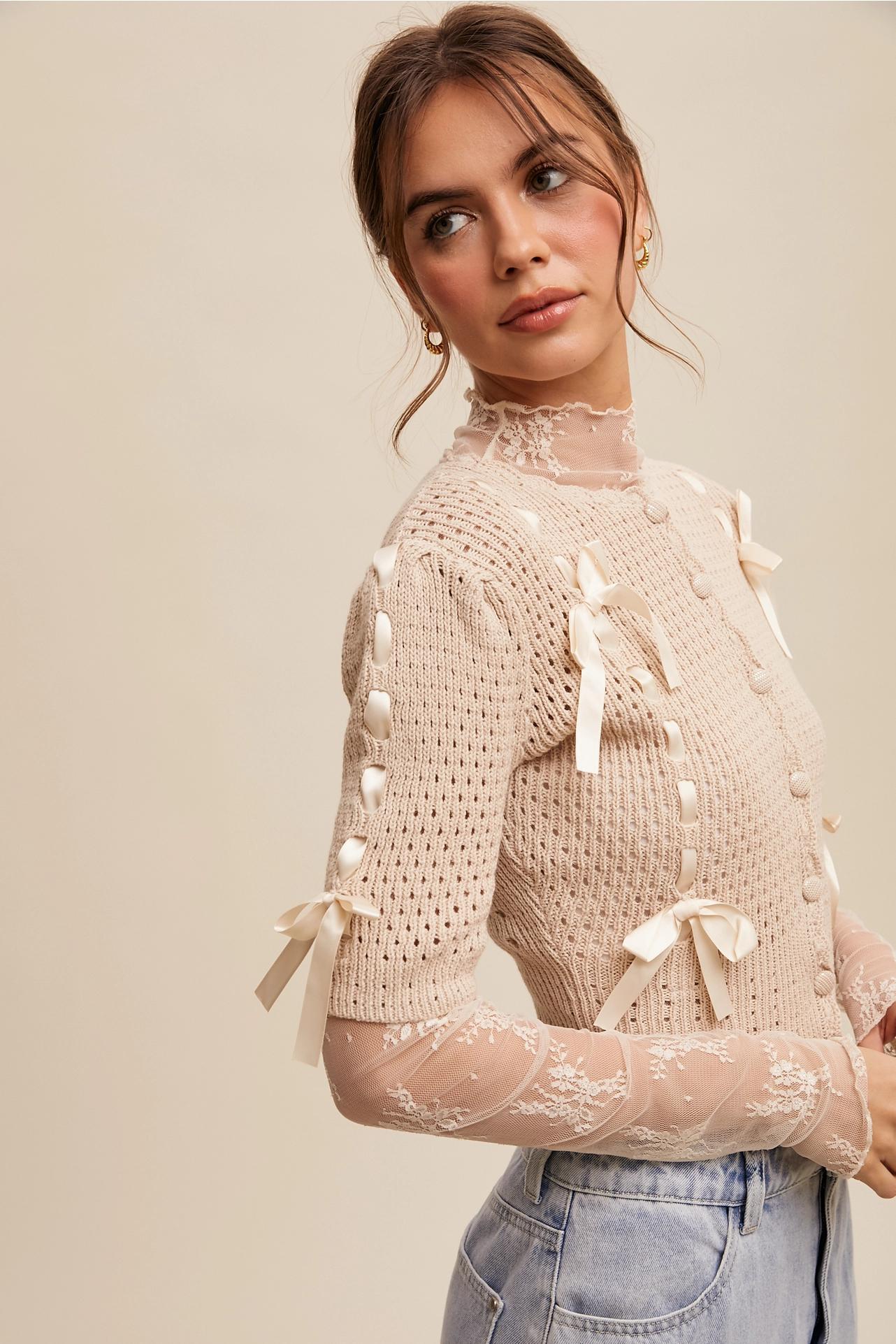 The Knitted Cardi your new bestie. Featuring delicate scalloped edges, feminine ribbon bow, sand covered button closures. With slightly puffed sleeves at an elbow length, this cardigan offers a soft and elegant silhouette for any occasion. 100% Cotton. Machine wash cold delicate, lay flat to dry. Measurements are taken flat, fabric has good stretch.