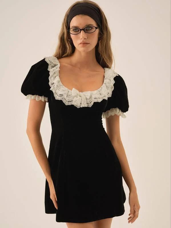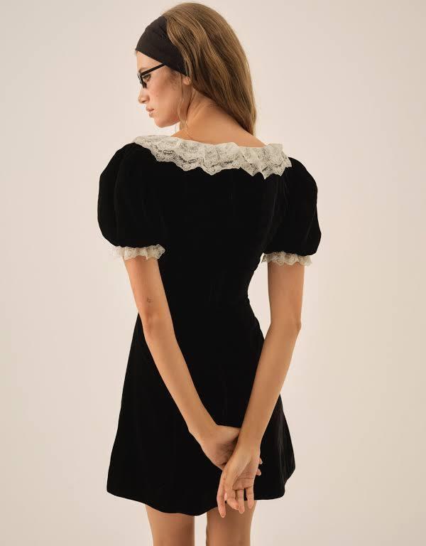 Crafted in rich velvet, La Vie en Bow black mini dress is an elegant yet playful option for your a next event. Featuring a scooped neckline and short puff sleeves with delicate lace trims—this velvet mini dress is finished with a single lace bow at the neckline for that perfect doll party look. Dress is fully lined. Crafted in 100% Polyester. Dry clean only.