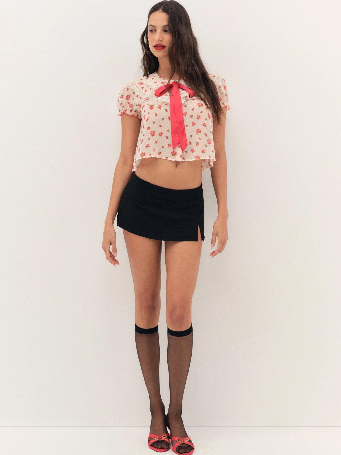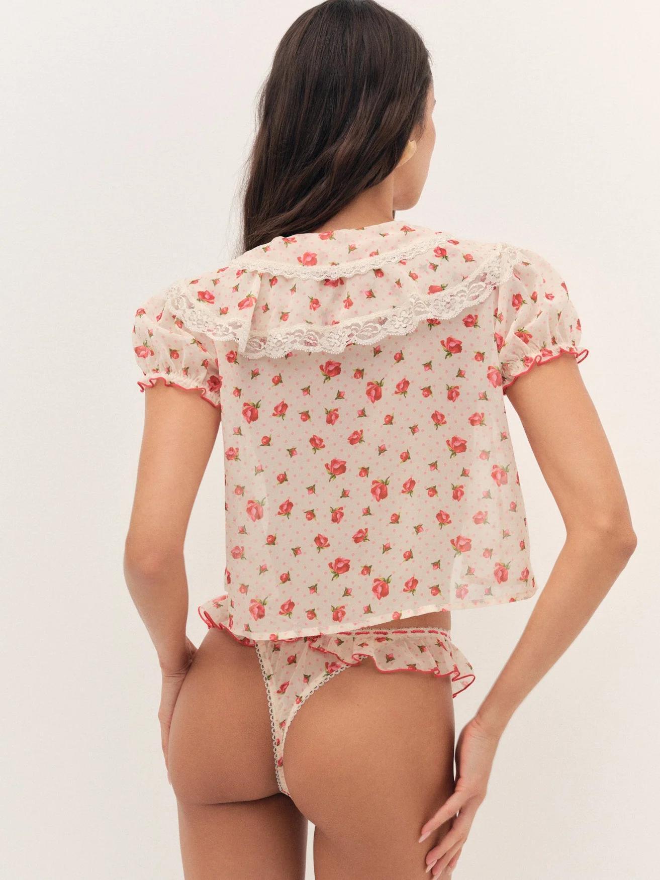 Sweet as a garden daydream, the Leah Chiffon Crop Top blooms with rosebuds, short puff sleeves, and a satin bow. Plus, its Peter Pan collar and frilly lace trim give it a nostalgic charm. Featuring a a functional satin bow at center-front neckline, flared, boxy body and functional center-front buttons. Crafted in 100% polyester, lace is made of 100% polyamide. Hand wash cold, hang to dry.