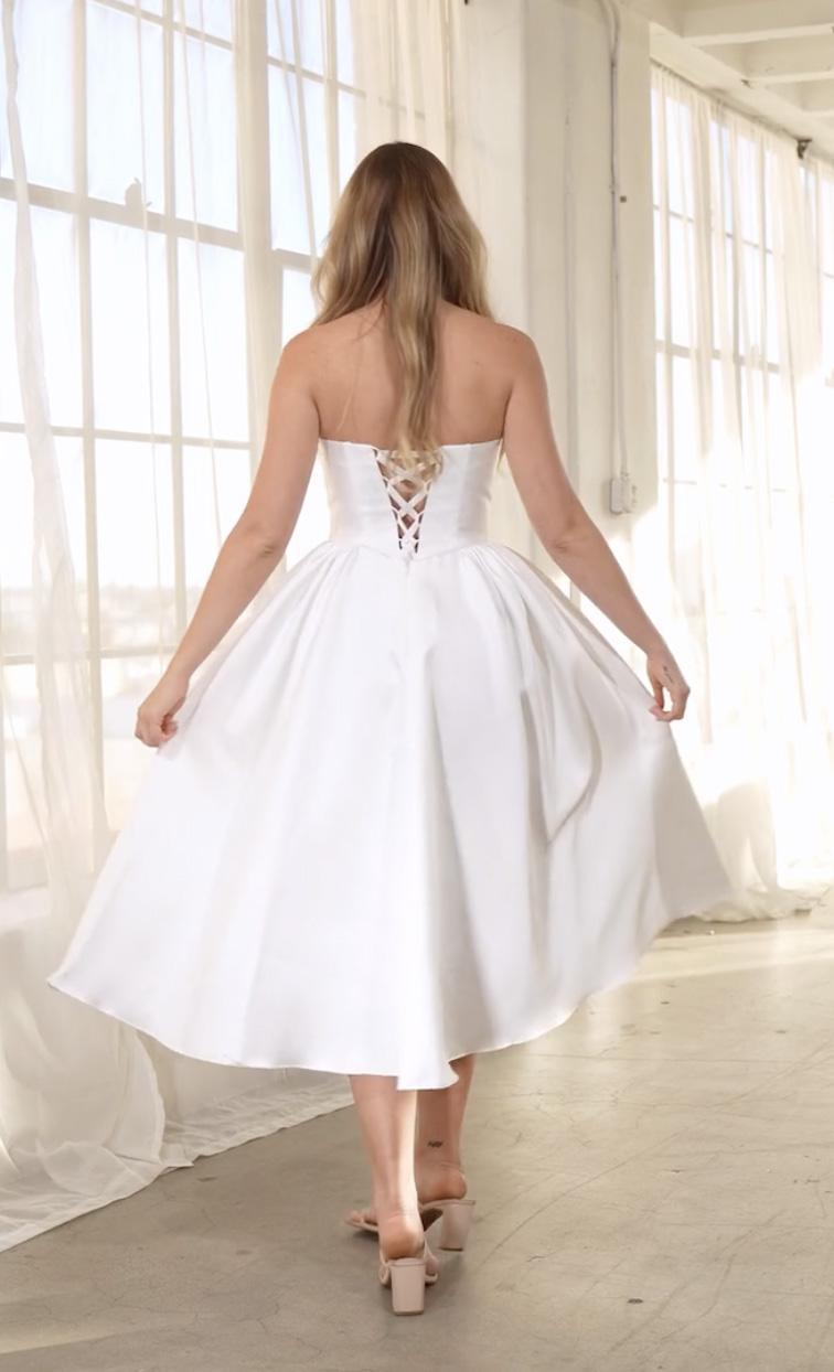 A modern bridal moment begins with this effortlessly chic Michaela midi gown. Designed for the bride who loves clean lines and timeless romance, this strapless silhouette features a sculpted bodice that enhances the waist while offering beautiful structure and support. The full midi skirt creates soft volume with every step, striking the perfect balance between classic elegance and contemporary simplicity. Finished with an adjustable lace-up back for a customizable and elegant fit. 100% Polyester. Professional spot clean only. Fabric does not stretch. Available for custom order in your size, contact us here.