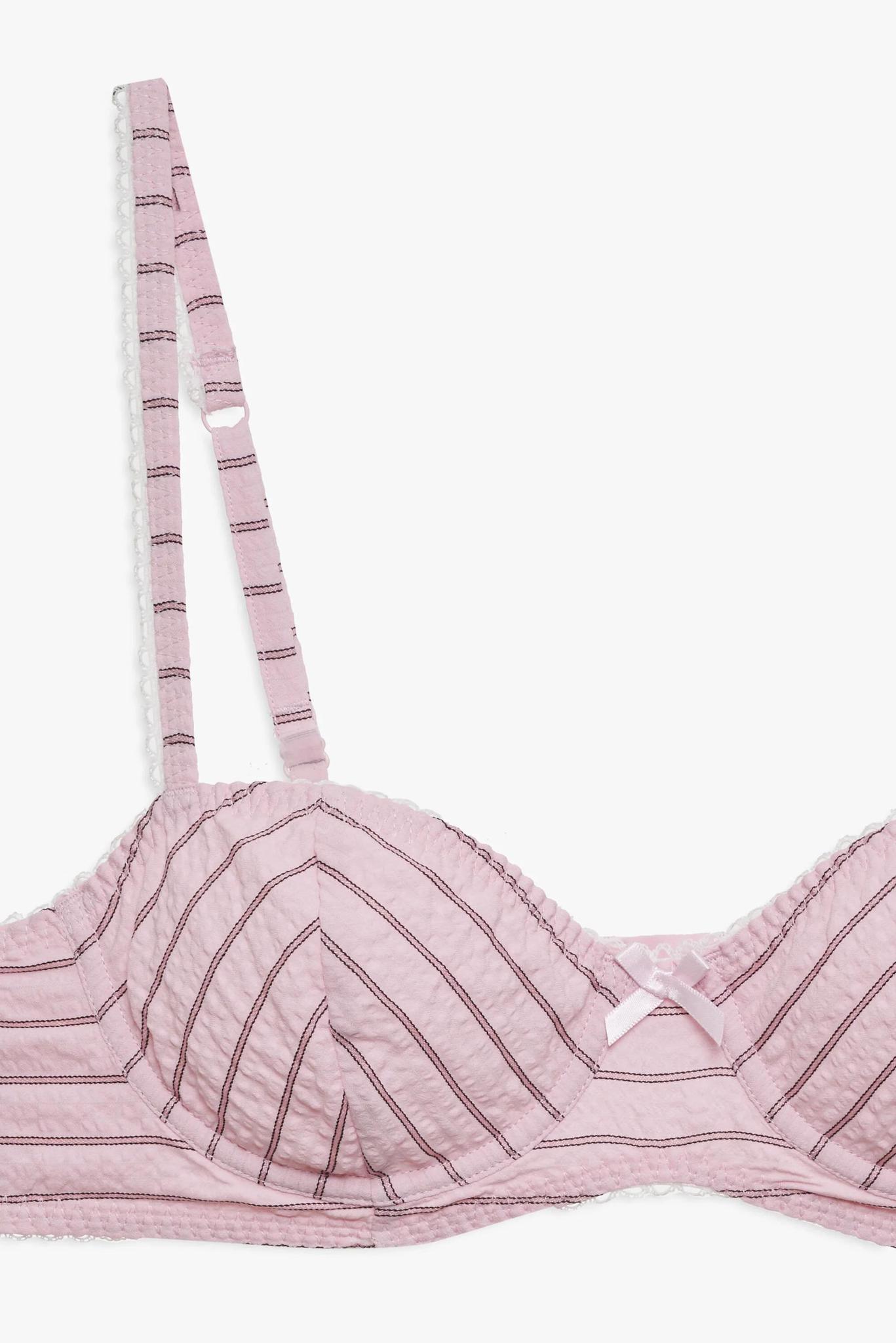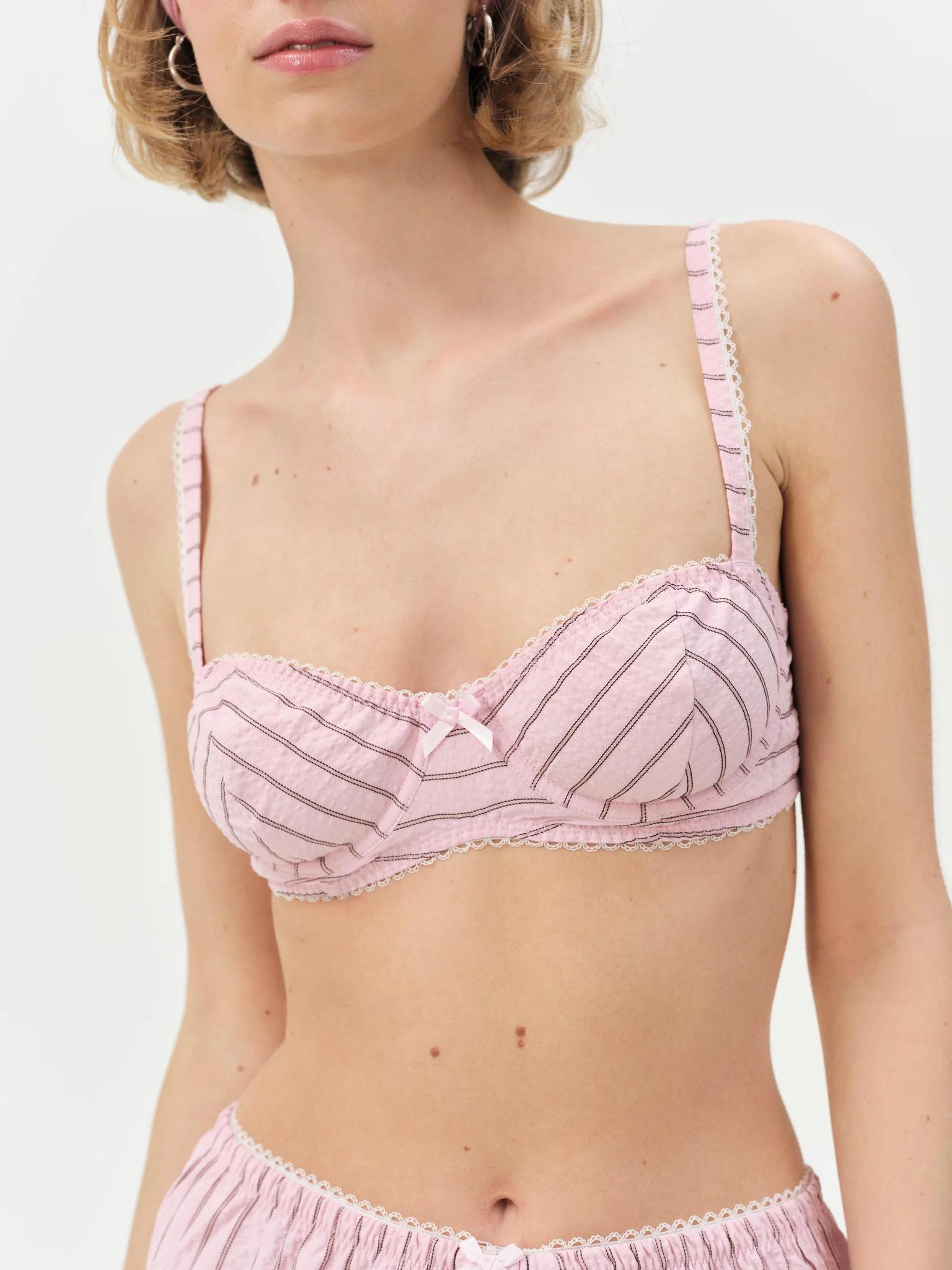 For the cutest stay-at-home uniform, the Mindy  bra makes for an effortlessly chic look. Crafted in a classic seersucker stripe, this pink bra spotlights underwire cups and is adorned with picot trims and a decorative bow at front. Pair with the Mindy Boxer Short for a complete co-ord look. Crafted in 50% polyester, 50% cotton. Lining is made of 100% polyester. Hand wash cold, hang to dry.