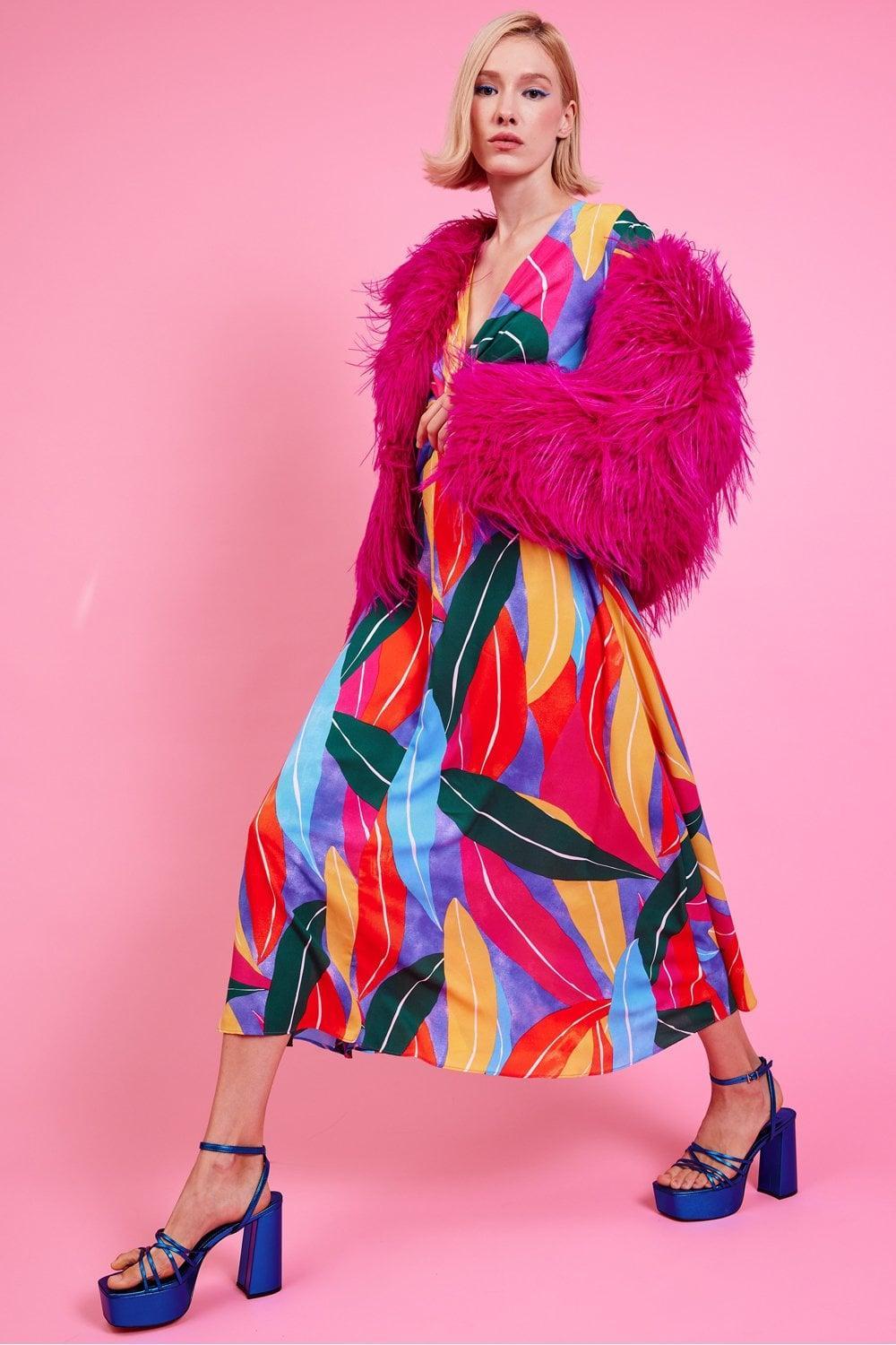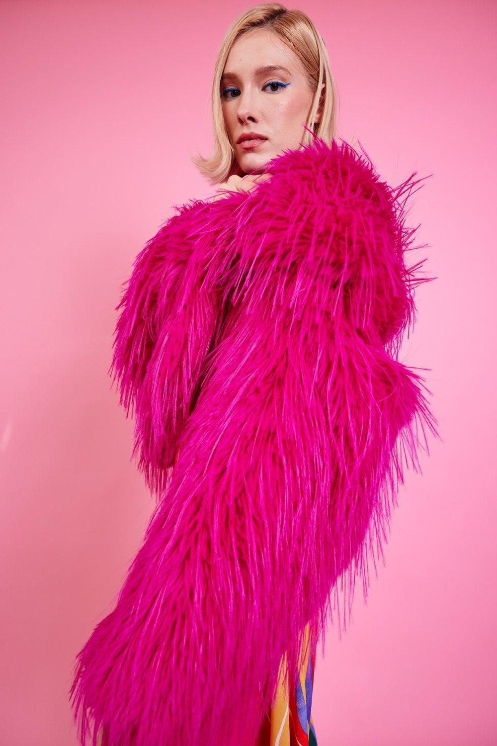 Made from luxurious and sustainable bamboo-based faux Mongolian fur, the Mongo Jacket features a boxy silhouette with oversized lapels, dropped shoulders atop full length sleeves, a playful multicolor leopard print lining, and a front hook and eye closure. 15% Tencel, 29% Bamboo Lyocell, 56% Modacrylic shell; 100% Viscose lining. Dry clean only. Available in Black or Fuchsia.
