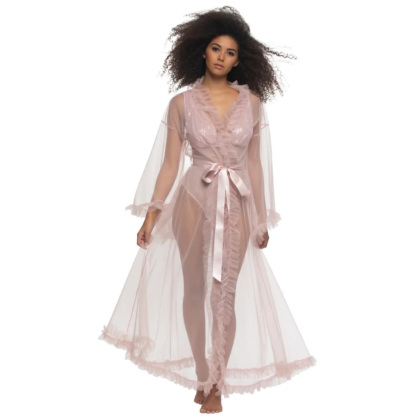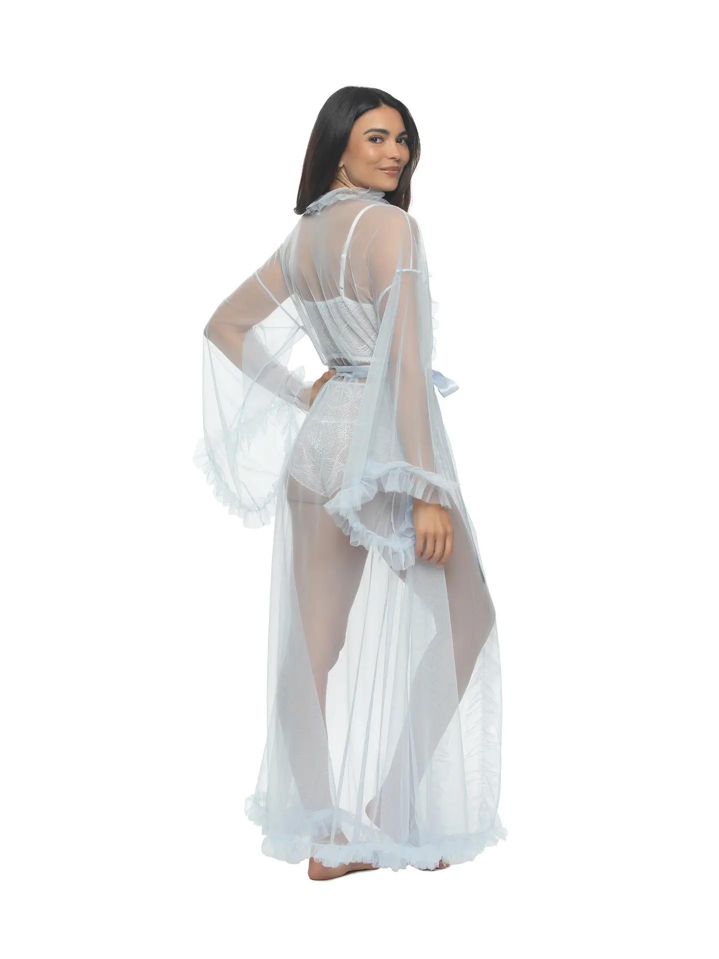 This classic Old Hollywood ‘Peignoir’ robe is created from a voluminous, playful tulle main body w/ 2” tulle ruffle trim at hem, along neckline, and at voluminous sleeve hem. Double-faced 1 1/2” satin sash wraps all the way around, held in place with satin ribbon loops at side seams. An elegant, dramatic, sexy addition to any lingerie assortment. 100% Polyester. Available in Blue or Pink. Machine wash cold gentle in lingerie bag, hang to dry.