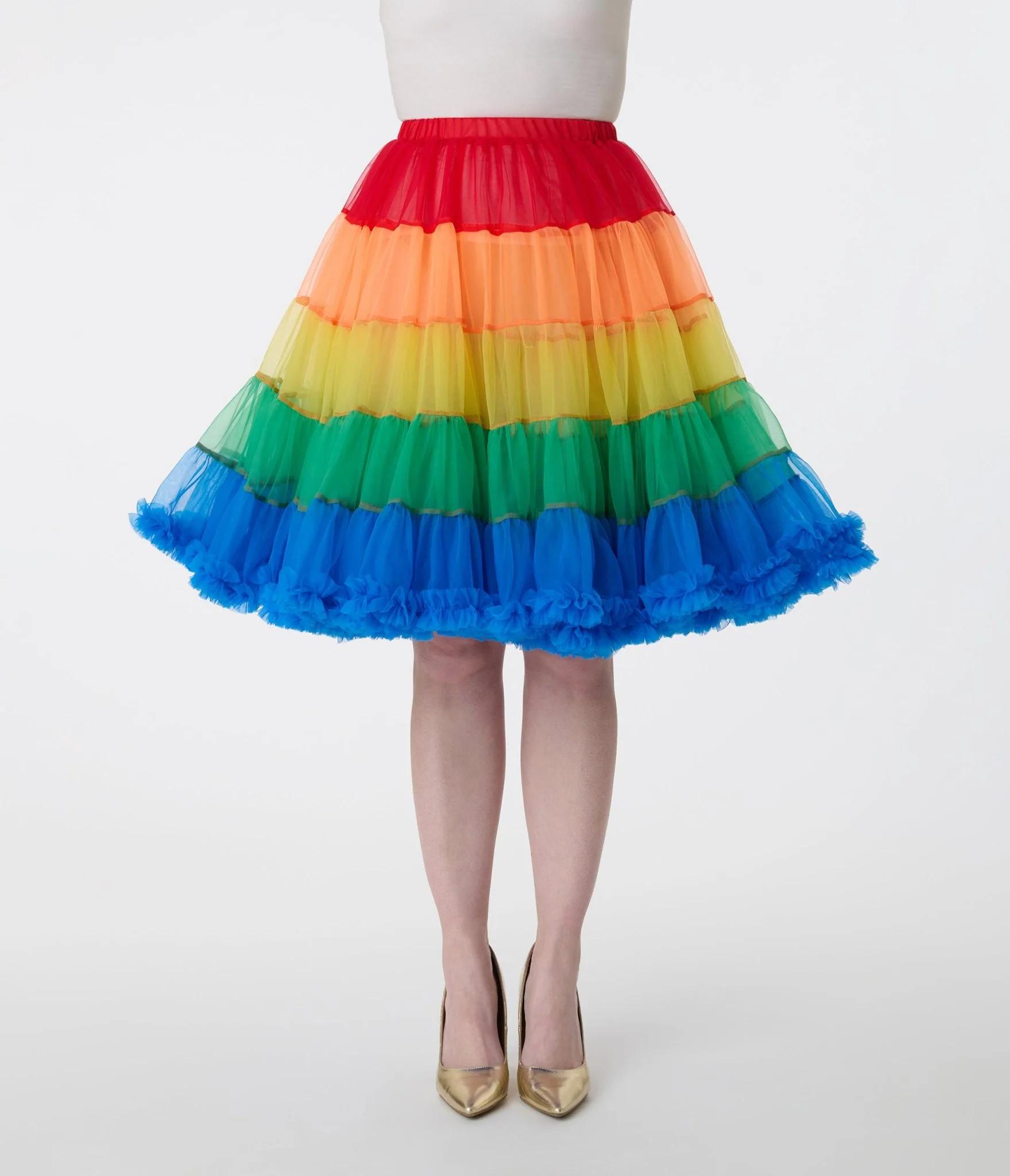 There’s nothing like a little vintage volume, is there dames? Add extra oomph to make your favorite frock look authentically retro with this 1950s-style rainbow nylon crinoline petticoat! For a dramatically flared swing look reminiscent of the 1950s, this soft tiered petticoat will give you the very same look with tons of fabulous volume that’s perfect for the dance floor. Its one-size-fits-most elastic waist is comfortable, light and easy to wear, boasting two layers with ruffled hem detail for a feminine touch. While many petticoats are itchy and uncomfortable, this one will give you the volume that you need without the annoying discomfort of those from years gone by. 100% Nylon. Hand wash cold, drip dry.