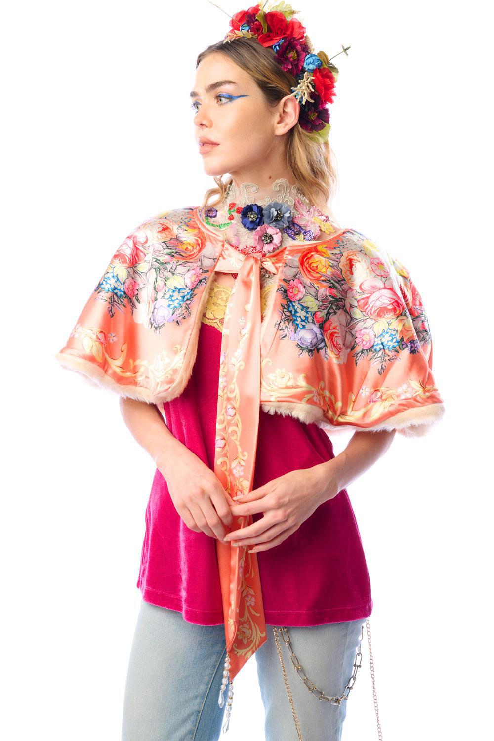 Elevate your look with the reversible Faux Fur Capelet! Crafted from silky soft faux fur with a luxurious floral print shiny satin lining. Printed ties have crystal tassels at the ends, which add a glamorous feminine touch. 100% polyester, lining 98% polyester, 2% spandex. Dry clean only. Available in Ivory, Pink, or Black. Cape length measures 12″.