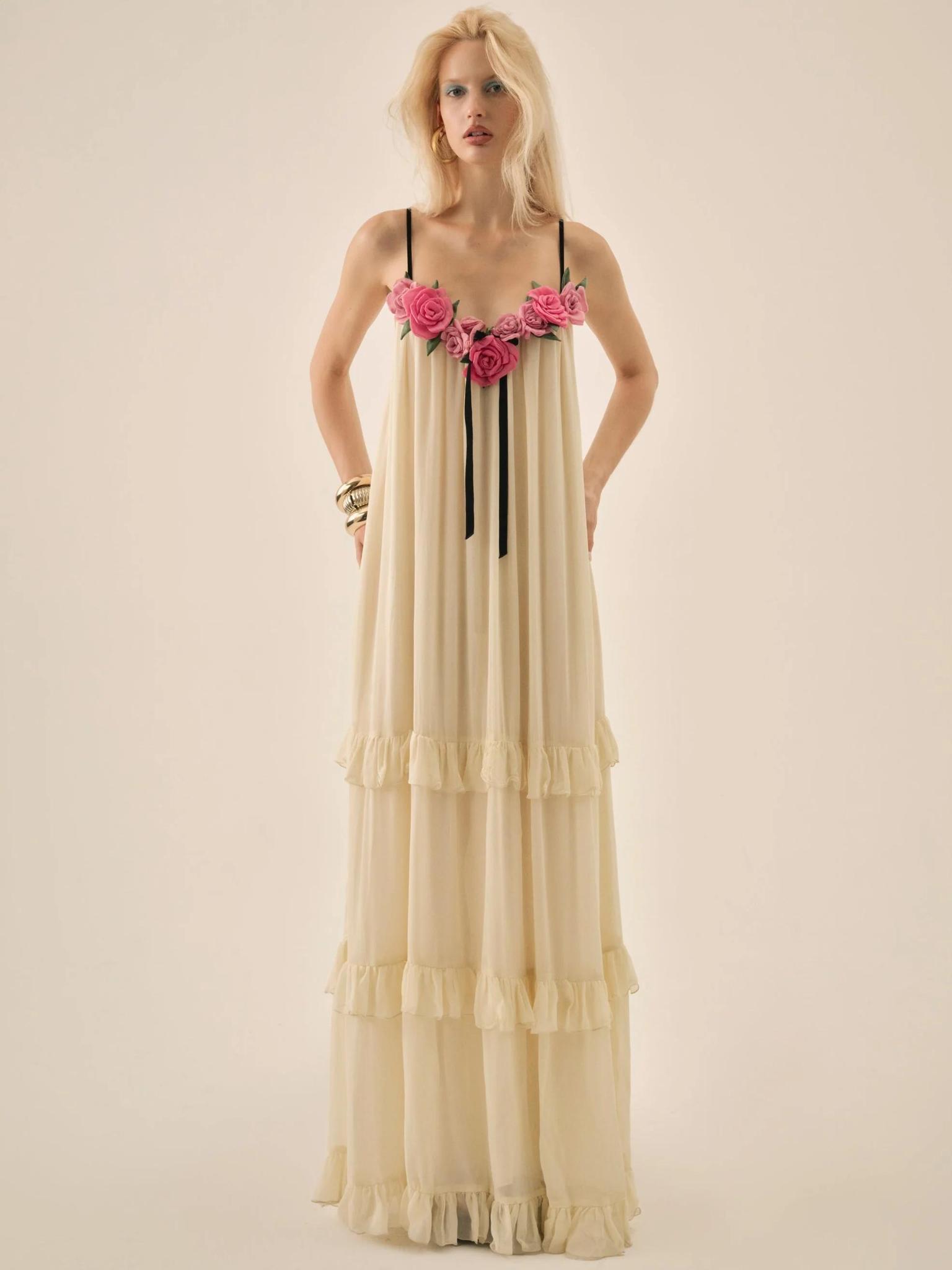 Become the belle of the ball in the Rosalie cream maxi dress – a long gown crafted in a semi-sheer georgette with contrast velvet shoulder straps and intricate handcrafted rosette embellishments along the neckline. This party dress features tiered ruffles along the skirt and gathering at the neckline and ruffle seams for an ethereal silhouette. Featuring adjustable shoulder straps, center-front bow with a functional drawstring back. Dress is fully lined. Each rosette is made lovingly by hand and may vary in size and shape. Crafted in 100% viscose. Dry clean only.